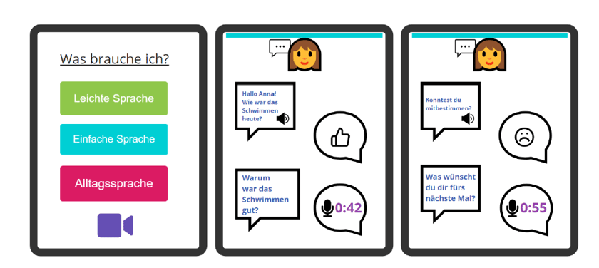 Um betroffenen Menschen mit dieser Aufgabe keine neuen Hürden aufzubürden, bietet das Assistenztool „Hier geht’s um mich“ allen Nutzer*innen entsprechend ihrer Fähigkeiten die Möglichkeit, entweder über Text- oder Spracheingabe Bewertungen durchzuführen. Wahlweise stehen bei der Nutzung – je nach Bedarf – Leichte Sprache, Einfache Sprache oder Alltagssprache zur Verfügung. Ebenso berücksichtigt das Tool unterschiedliche Aufmerksamkeitsspannen der Nutzer*innen und meldet sich proaktiv mit Interaktionsaufforderungen. Die erfassten Daten können dann an die zuständige „Behörde“ übermittelt werden.