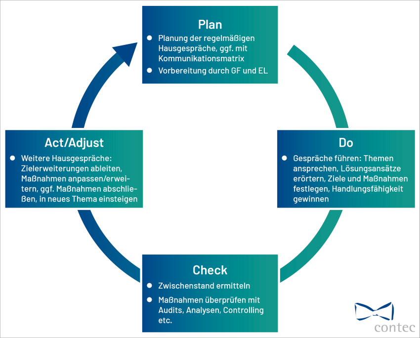 Als methodische Stütze für die Hausgespräche kann u. a. der PDCA-Zyklus mit den vier Phasen Plan-Do-Check-Act dienen: